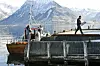 Postmann Bjarne Eidsvik har nyss lagt til kai på Snilstveitøy. Handelsmann Bjørn Arne Eidsvik har henta ferske brød, og iler opp til butikken med varene. Brørne er to av det halvdusinet fastbuande på øysamfunnet.