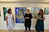Airin Zimmer (t.v.) ynska i dag kunstnarane Kari Ekaas og Lise Nilsen velkomen til Galleri Banken.