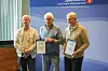 F.v. Øystein Kårstad, Trygve Gjuvsland og Jan Åge Thingvoll tok imot to gåver til Varaldsøy Bygdalag frå Kvinnheradstiftinga.