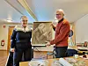 Malena Aasen frå Ølve mållag overrekte eit kunstverk av Ivar Aasen til Kristian Bringedal frå Kvinnherad mållag.