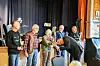 Kristian Bringedal, leiar i Uskedal historielag, delte ut roser til skriftstyret. F.h. Thor Inge Døssland, Harald Sætre, Astrid Haugland og Svein Rimestad. Til venstre står Ståle Eik, som er kasserar i historielaget. Torkel Stensletten er også med, men var ikkje til stades denne dagen.
