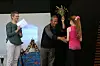 Sonam Sherpa fekk bukett av Gjøa Bondhus og gåvesjekk av Hanne Sandvik under besøket i Mauranger tysdag kveld.
