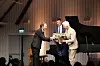 Jon Askeland (t.h.) og Vegard Bjørnevik overrekte kvar sin bukett til Leif Ove Andsnes.