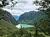 Det er gått eit 150 meter breitt ras over stien som går langs vestsida av Bondhusvatnet, til venstre i dette biletet frå 2020. (Arkivfoto)