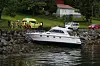 Ein fritidsbåt har køyrt på land i Langåt på Husnes. (Foto: Marius Nissestad)