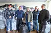 Ein skulder-operert Tormod Myklebust (t.v.) hadde laurdag god hjelp av Renaldas Bute, Thor Arne Eik Nygård og Leif Jarle Bergstø i mottaket til THK-stiftelsen. Rita Kaldestad var innom for å levera frå seg nokre sekker med klede.