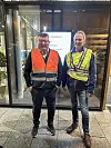 Utvalsleiar Arve Helle (t.v.) og medlem Gunnar Moland deltok på refleksaksjonen i Bergen torsdag morgon.