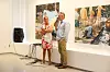 Kunstverka til Tor-Arne Moen imponerte nok dei fleste som tok turen innom galleriopninga i Guddal laurdag. På bilete: Gøril Guddal og kunstnaren sjølv Tor-Arne Moen.