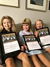 Erika Bondhus (5), Ida Bondhus Holmedal (3) og Mari Bondhus Holmedal (7) har fått velfortent diplom frå Redd Barna.