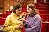 Her er Nora og Helene i telefonen med det lokale bandet Inator, som også blir med på støttekonserten førstkomande søndag.