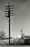 Dei gamle telefonstolpane skal fjernast om nokre år. Biletet viser ein telefonstolpe med stolpestol og ein rund, høg fordelarkasse, cirka 1960.