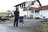 Thore Medhus saman med hunden Balto utanfor det som var heimen. Han ønskjer ikkje å stå fram med fullt bilde av seg sjølv i avisa slik ting er no.