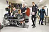 Rolf Hunstad (t.v.), Gunnar Leite og Jarle Bruntveit (t.h.) har fått eit løft i dobbel forstand etter at Hjelpemiddelsentralen kom i nytt hus. Storm Rusten Hermansen er på utplassering hus trioen.