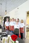 Bra lunsj café sine tilsette kunne smila på opningsdagen: F.v. Trine Lise Marthinussen, Lene Vågenes, Charlotte Berntsen, Guro Berntsen, Merete Berntsen, Eline Teigen (fremst) og Vivian Vågenes Øvstebø.