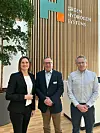 Denne trioen kan smila etter å signert ny kontrakt på onsdag. Frå venstre: Veronica C. Haugan, leiar for teknologi og innovasjon i Hydrogen Solutions (HYDS), Knut Førland, dagleg leiar i Liquiline, og Jesper Fruergaard Andersen, salssjef i Green Hydrogen Systems. Foto: Liquiline.
