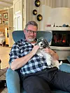 Lars Emil Berge kosar seg heime i stova, med varme i omnen og hunden Chanmi på brystet.