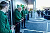 Flankert av lærlingane Rick James Turner (t.v.) og Oskar Kaldestad, fekk styreleiar Gunnar Våge æra av å klypa fiberkabelen i to og offisielt opna det nye bygget til Kvinnherad Breiband.