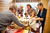 Bente Rusten (t.v.) hadde åtte openberingar å rulle ut. Eddik og rustvatn frå august, samt planter og anna knask frå området rundt rohuset, hadde sett farge og mønster på fleire tekstilar.Elna Marie Fludal, Wenche Tysse Sjo og Wenche Seljestad vart begeistra over resultata.