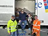 Denne gjengen tok i mot naudhjelpa til Ukraina medan traileren stod i Rosendal. F.v. Tormod Myklebust, Vidar Akselsen, unge Maxim som sjølv kjem frå Korosten i Ukraina, og Leif Nygård.