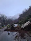 To bilistar heldt på å køyra i raset ved Austrepollen tysdag morgon. Den eine måtte rygga vekk, og kom seg så vidt i sikkerheit før resten av steinane datt ned i vegen.