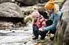 Eirill (4) ser barkebåten sin segla nedover elva, medan mor Kristin Lilleheim gir ho ei trygg hand å halda i.