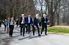 Statsminister Jonas Gahr Støre på omvisning under besøket på Valen sjukehus. Nr. to frå venstre er administrerande direktør Anders Hovland, og til høgre klinikkdirektør Kenneth Eikeset.