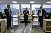 Fylkesvaraordførar Stian Davies klippte snora og erklærte nybygget for offisielt opna. Kunstverket av Henrik Wergeland, den fyrste riksarkivaren, er ei gåve frå arkivfagmiljøet i Hansaparken i Bergen. F.v. ordførar i Sogndal, Stig Ove Ølmheim, fylkesvaraordførar Stian Davies og leiar for seksjon arkiv, Arnt Ola Fidjestøl.