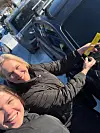 Ordførar Thea Vaage og Elin Agdestein Gran i Trygg Trafikk delte ut bøter utanfor rådhuset.