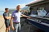Geir Olav Guddal og sonen Sigbjørn viser kvar båten deira vart treft.