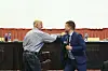Eldrerådsleiar Vidar Ask og ordførar Hans Inge Myrvold helsa på kvarandre på korona-vis.