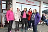 Det var stor aktivitet utanføre lokala til Kvinnherad Vekstbedrift då THK-stiftelsen inviterte til Ukraina-dag med innsamling. Nataliia Leskova (f.v.), Viktoriia Chernyshuk, Nataliia Khomenko, Marharyta Mytriienko og Khatuna Ivaniuta-Murdzhydze song ukrainske folkeviser.