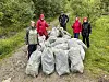 25 sekkar på knappe to timar var resultatet då Naturvernforbundet i Kvinnherad inviterte til aksjonsdag. Aina Solberg (t.v.), Hilde Blokkum, Sindre Aksnes, Marit Tarlebø og Toril Byrkjeland Tjelmeland gjorde ein solid innsats, saman med Trude Aarsand og Sigve Solheim.