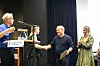 Gunnar Våge (t.v.) og Tilde Ølfarnes delte ut gåve til Øystein Svendsen og Sissel Haugen frå Fjellhaugen skisenter.
