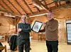 Svein Åge Vangdal overrekte gåve til ein inkjeanande Gunnar Våge under Senterpartiet sitt årsmøte måndag kveld.