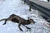 Ei hjortekolle vart påkøyrd mellom Erslandsvatnet og Leirvikvatnet på Sandvoll måndag morgon. (Foto: Atle Helland)