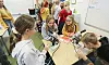 Elevane er i gong med å klargjera lauk for å kika på cellene i mikroskopet. F.v.: Ulrikke Johnsen, April Opsanger, Mina Dolonen-Marthinussen og Erlend Blokhus.