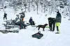 Fleire familiar hadde samla seg i akebakken oppe i Fjellhaugen skisenter på sundag for å nyta og nytta den ferske snøen. Frå høgre: Tore Jacobsen, Ådne Nyheim, hunden Sansa, Tobias Eikeland Jacobsen, Katrine Eikeland og Ida Gjengedal.