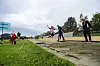 Amelia Skåla svevde gjennom lufta på opningsdagen til Rosendalsleikane. Sturle Kalstad og Knut Johannes Helvik (t.h.) var klare til å måla på centimeteren kor langt det vart.