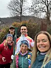 Her poserer Aud Janne Storedale (venstre) og veninnene, Isabelle Pedeluq (midten) og Maryann Huckvale (høgre) saman med den italienske idrettsutøvaren som hadde fått æra av å bera OL-fakkelen. Mannen i bakgrunnen fekk dei ikkje namnet på, men skal vera ein frå teamet kring idrettsutøvaren.