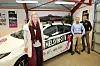 Passande nok har den nye bilen til skiskyttartalentet Ragnhild Femsteinevik ein blink på panseret og ein skiskytar på sida. Her er ho saman med Frode Thorsen (t.v.) og Asbjørn Anfinsen hjå Dimmelsvik Bil.