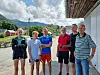 Det nye motbakkeløpet får start på Sandakaien i Uskedalen. Målgang er ved telemasta midt i biletet. F.v: Frøy, Trym og Birk Sæle, Tormod Myklebust, Tor Vidar Sæle og Audun Eik.